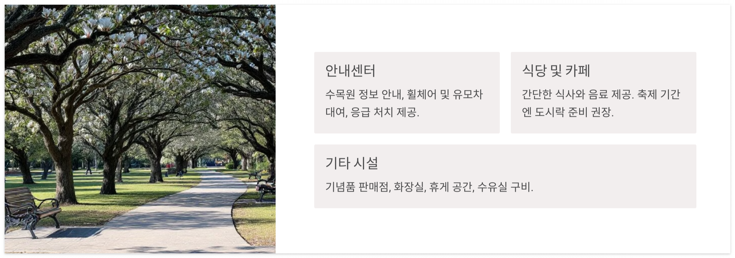 수목원 정보 안내, 휠체어 및 유모차 대여 (수량 제한), 응급 처치 등을 제공합니다. - 식당 및 카페 :