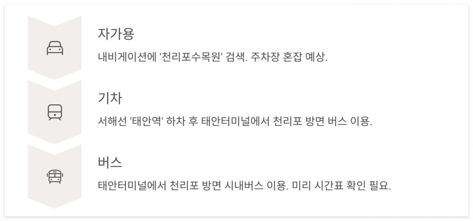 - 버스 : 태안터미널에서 천리포 방면 시내버스를 이용하시면 수목원 입구에서 하차하실 수 있습니다. 배차 간격이 다소 넓을 수 있으니, 미리 버스 시간표를 확인하시는 것이 좋습니다.