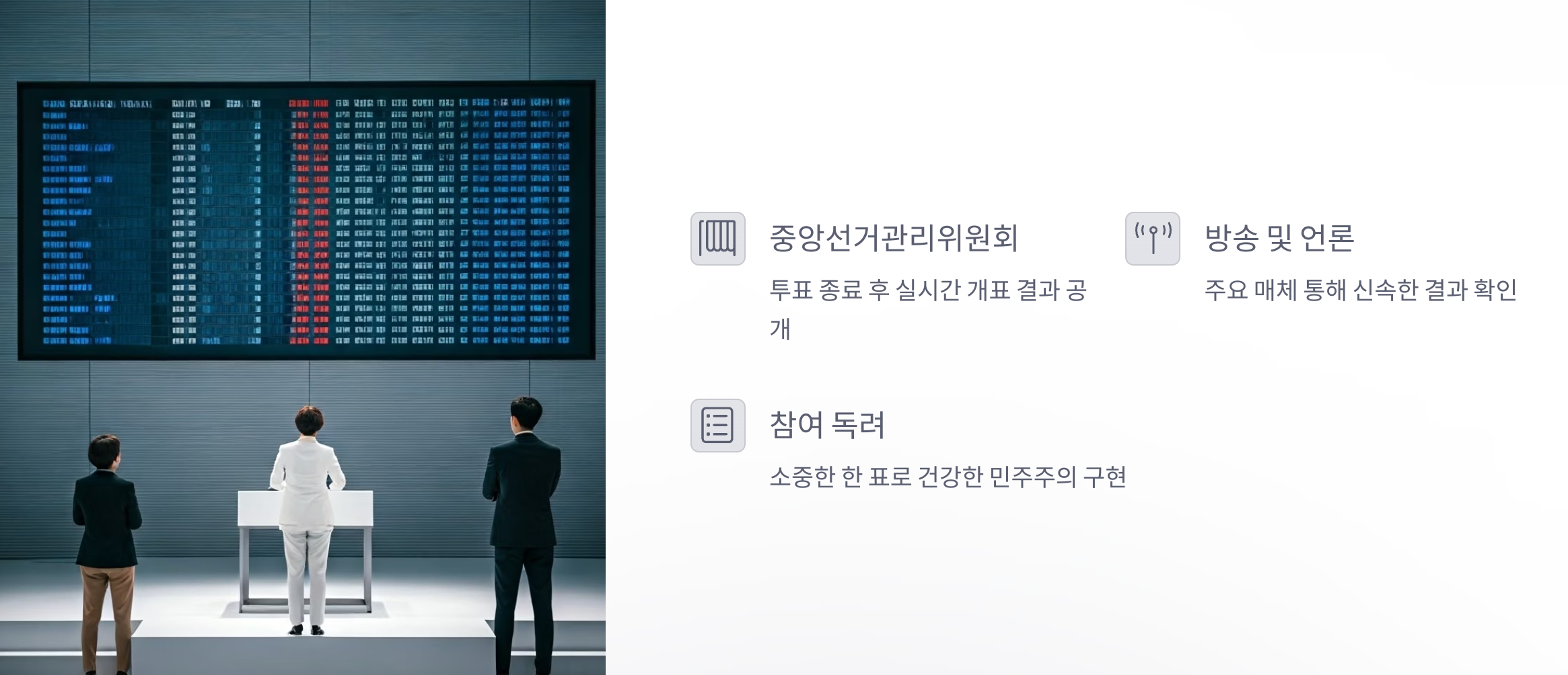 이번 선거는 대한민국의 미래를 결정하는 매우 중요한 선택의 순간입니다. 유권자 한 분 한 분의 소중한 권리 행사가 민주주의의 꽃을 피우는 밑거름이 됩니다. 이 페이지를 통해 정확한 정보를 얻으시고, 주저 없이 투표에 참여하시어 여러분의 목소리를 세상에 전달하시기 바랍니다.