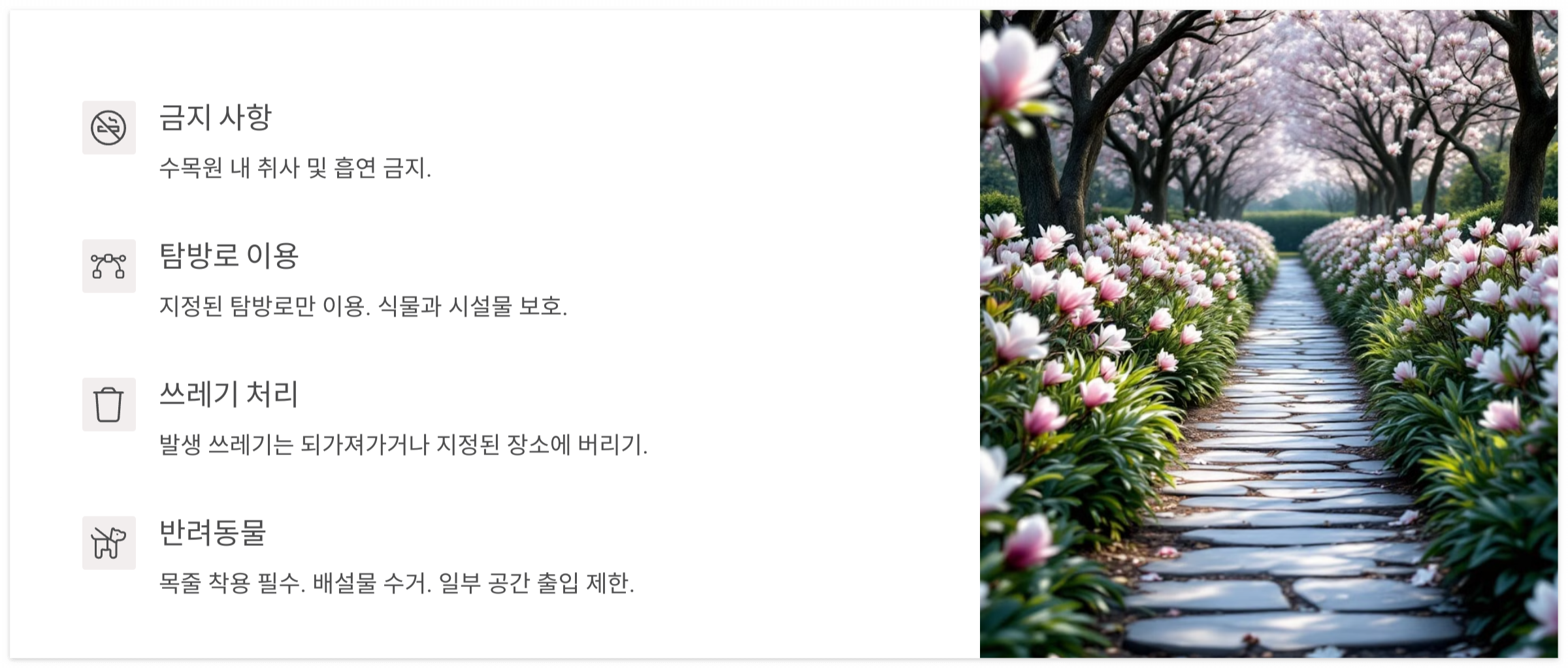 - 반려동물 동반 시에는 목줄을 착용해 주시고, 배설물은 반드시 수거해 주십시오. (일부 공간은 출입이 제한될 수 있습니다.)